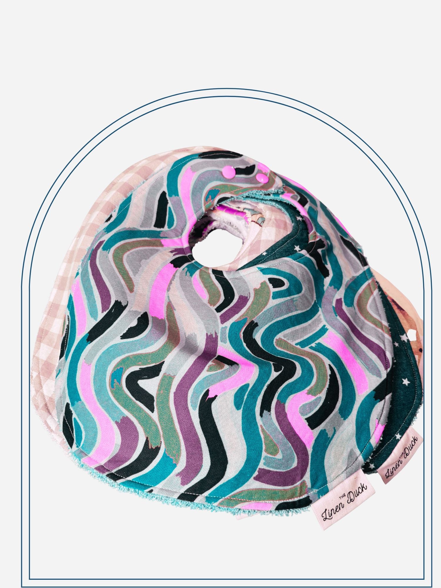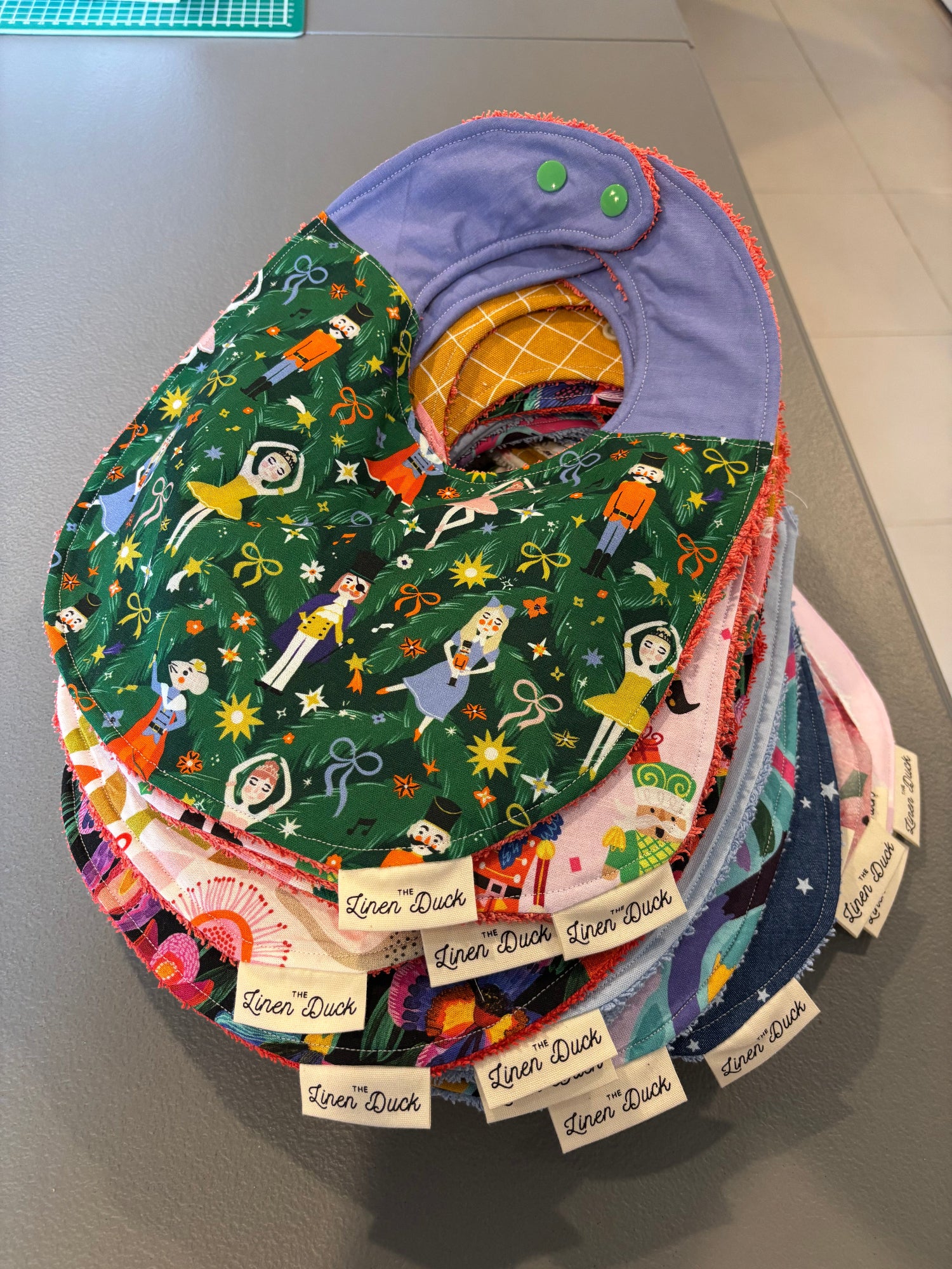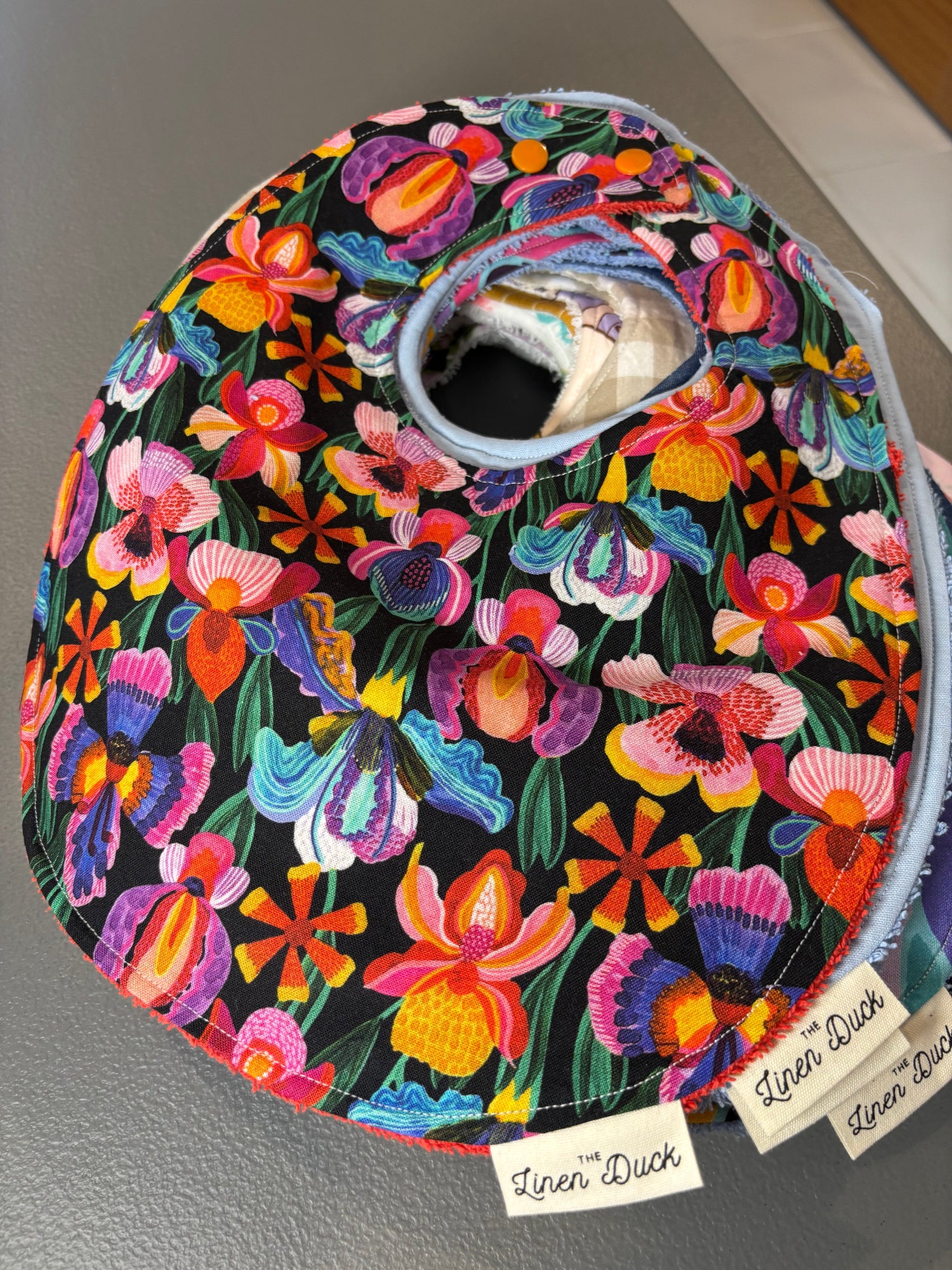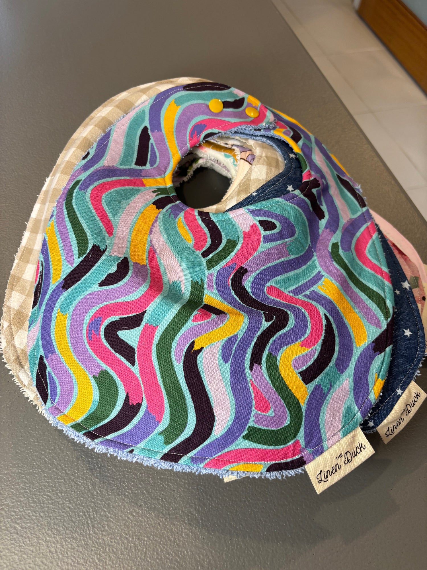 These bibs are made of bright and cheery cotton or linen, with repurposed toweling to catch spilled food or that drool! Two snaps on the back collar for comfort as your baby grows.