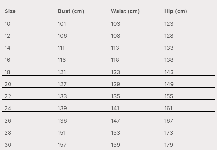 Size range: US women’s size 10-30.